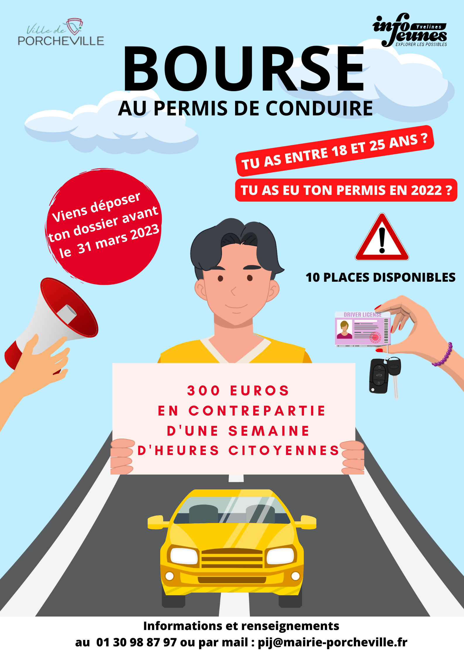 Renseignements auprès du point information jeunesse au 01 30 98 87 97 / 01 30 63 30 80 ou pij@mairie-porcheville.fr