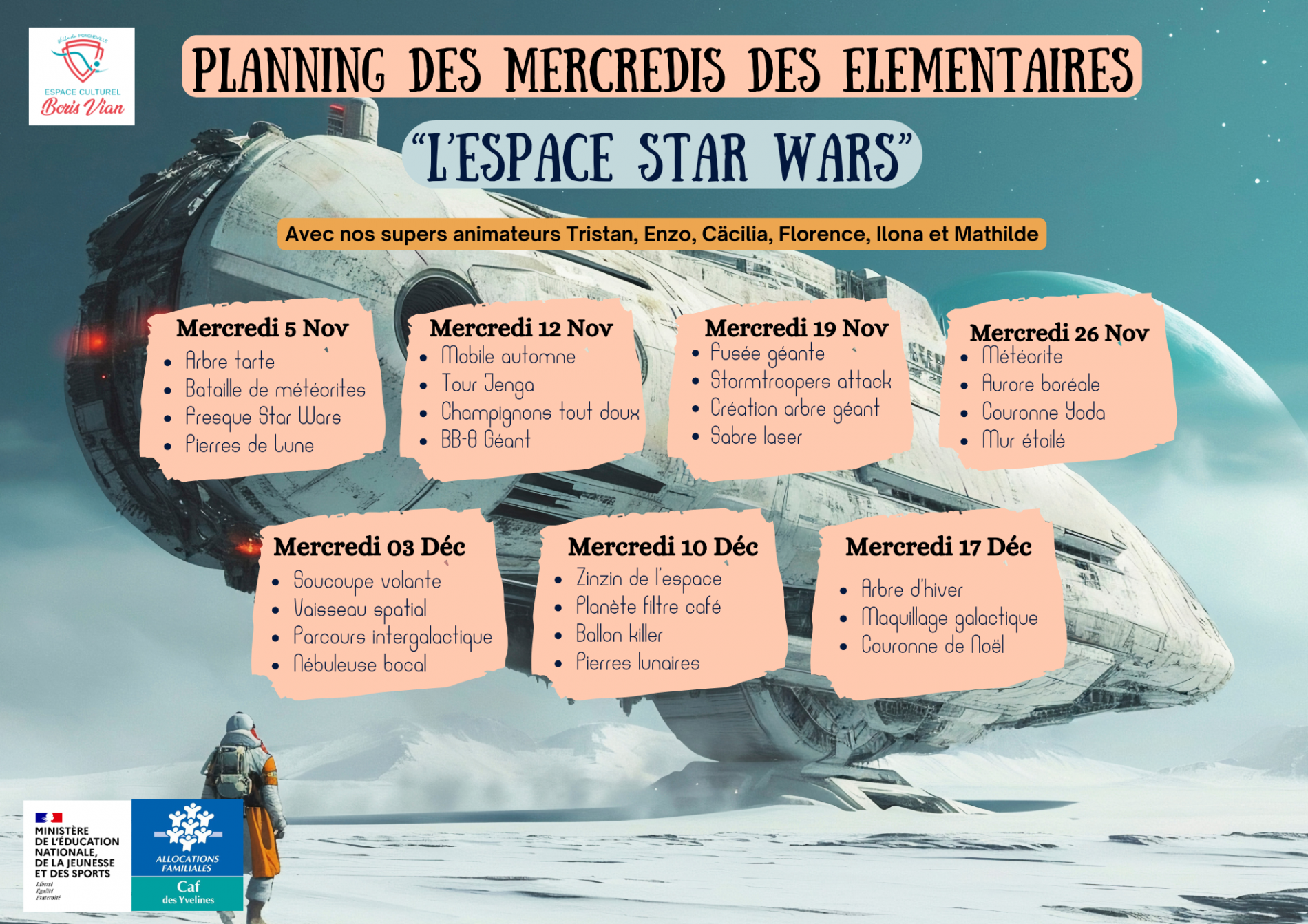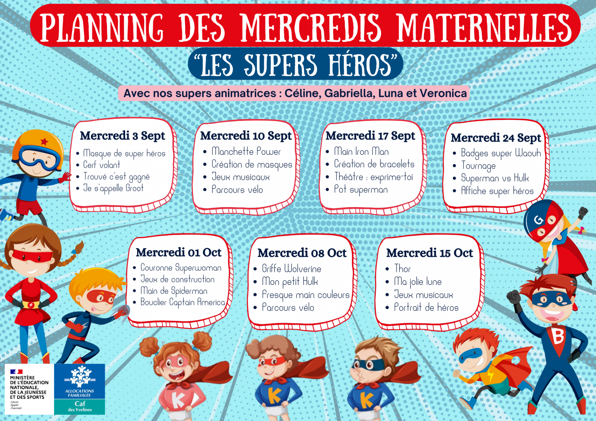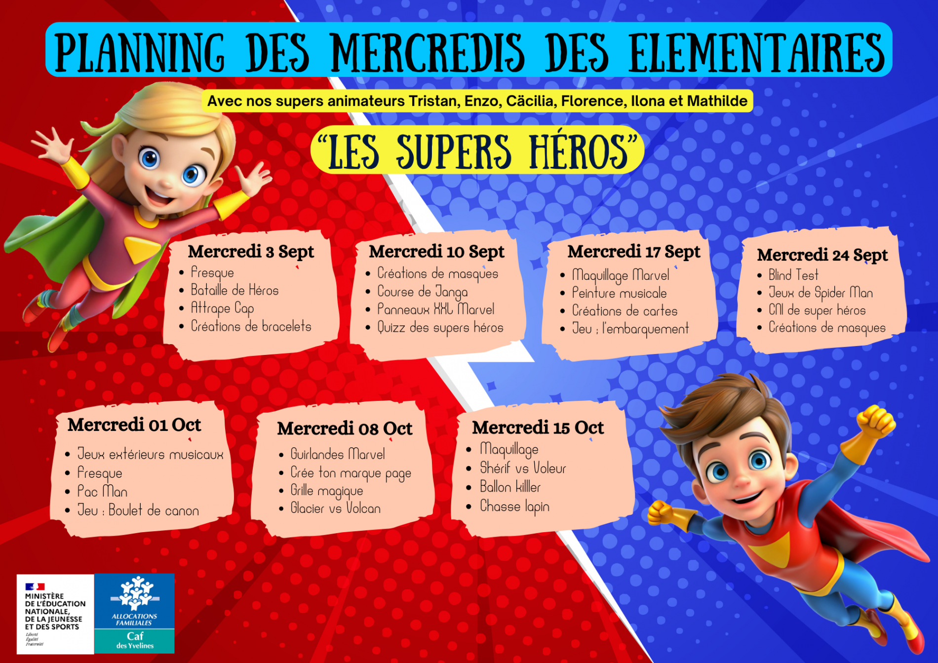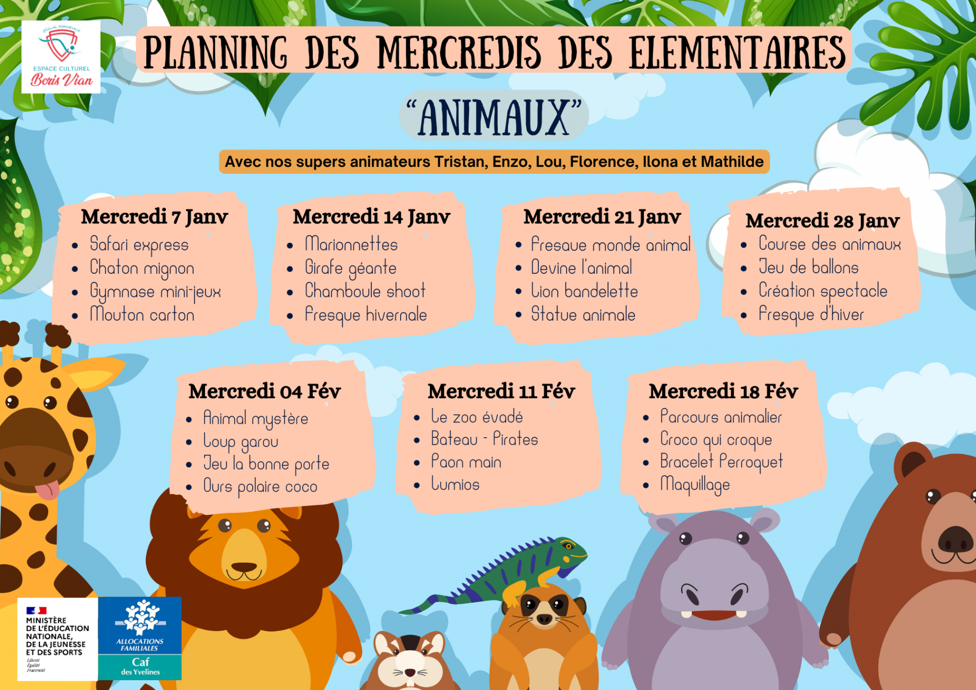 À noter, afin d'assurer le bon déroulement de certains ateliers, les animateurs pourront mener leur activités avec les enfants